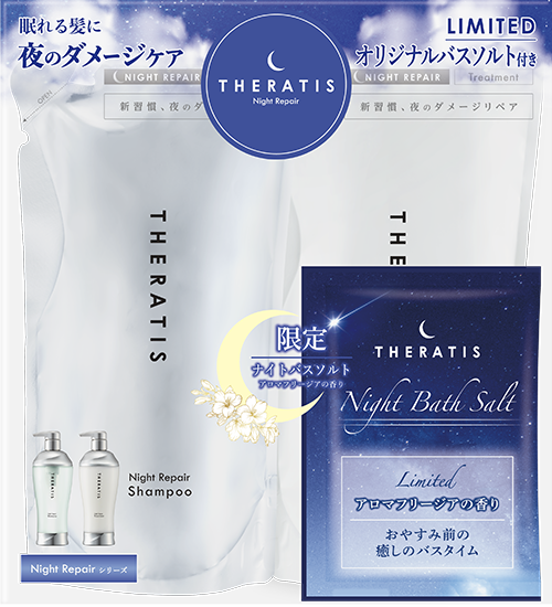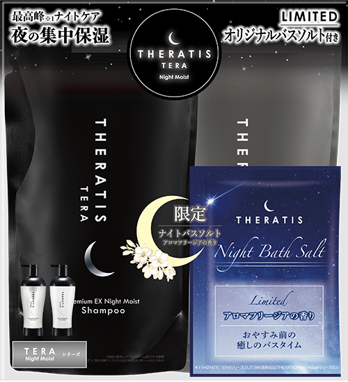 「ナイトリペア」、「テラ プレミアム EX ナイト モイスト」の3シリーズからオリジナルバスソルト付きの